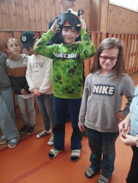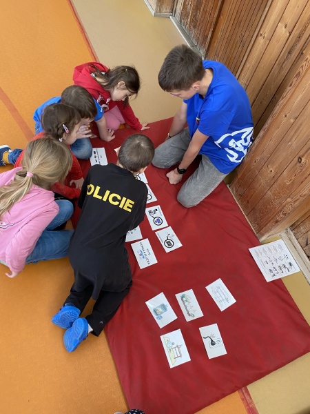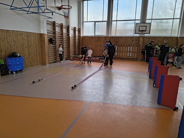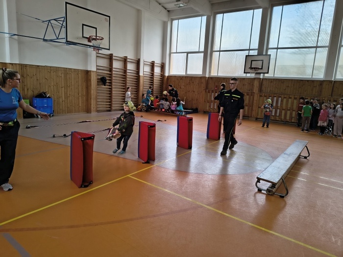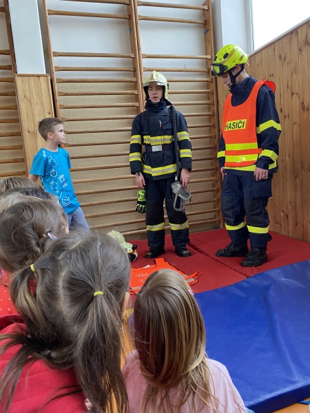 Zájmový útvar Mladý Hasič nám předvedl své pracovní oblečení, které si účastníci mohli opět vyzkoušet, zkusili si slalom v hasičské helmě a smotávání hadice.