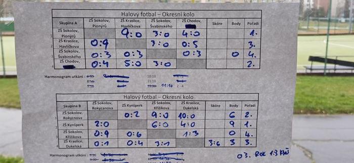 Osm postupujících škol z okrskových kol bylo nalosováno do dvou skupin, kterou jsme vyhráli bez obdržené branky: