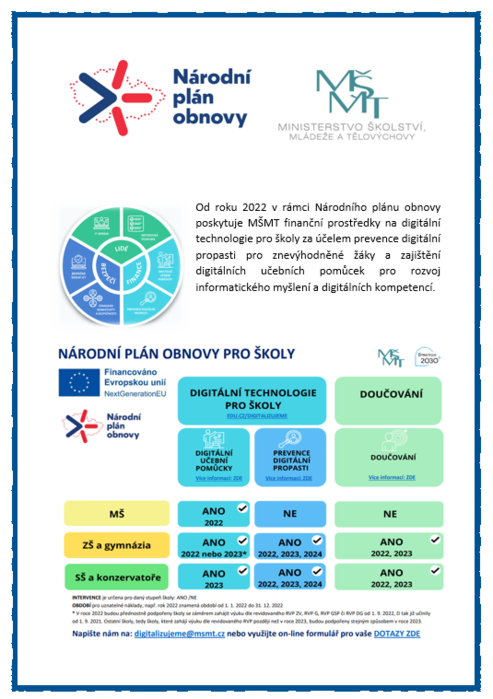 Od roku 2022 v rámci Národního plánu obnovy poskytuje MŠMT finanční prostředky na digitální technologie pro školy za účelem prevence digitální propasti pro znevýhodněné žáky a zajištění digitálních učebních pomůcek pro rozvoj informatického myšlení a digitálních kompetencí.