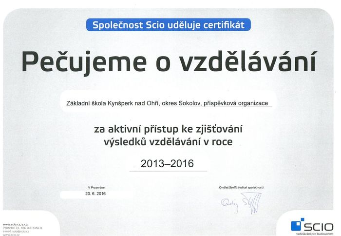 Společnost Scio uděluje certifikát Pečujeme o vzdělávání za aktivní přístup ke zjišťování výsledků v roce 2013-2016.