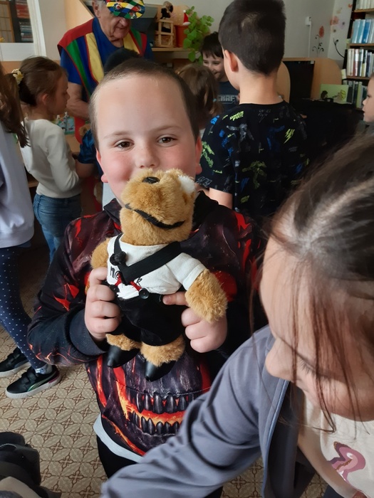 Po skončení vystoupení čekalo na děti překvapení. Paní knihovnice jim předaly plyšáky, sladkou odměnu a přívěsek jejich oblíbené postavičky Stitche, což jim udělalo obrovskou radost a vykouzlilo úsměv na rtu. Naše návštěva byla poslední v tomto školním roce a rozhodně se nám všem zapsala do paměti.