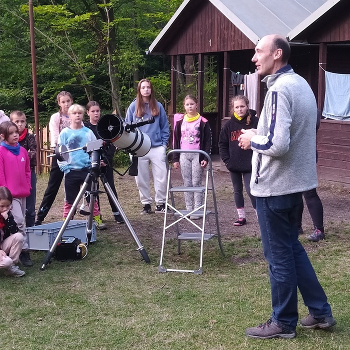 Návštěva pracovníků mobilní hvězdárny v táboře byla příležitostí k nočnímu pozorování hvězdné oblohy s výkladem odborníků. Zážitkem bylo sledování Perseidů, letadel, souhvězdí, planet a satelitů. Výlet do Techmánie v Plzni završil naši vesmírnou misi.